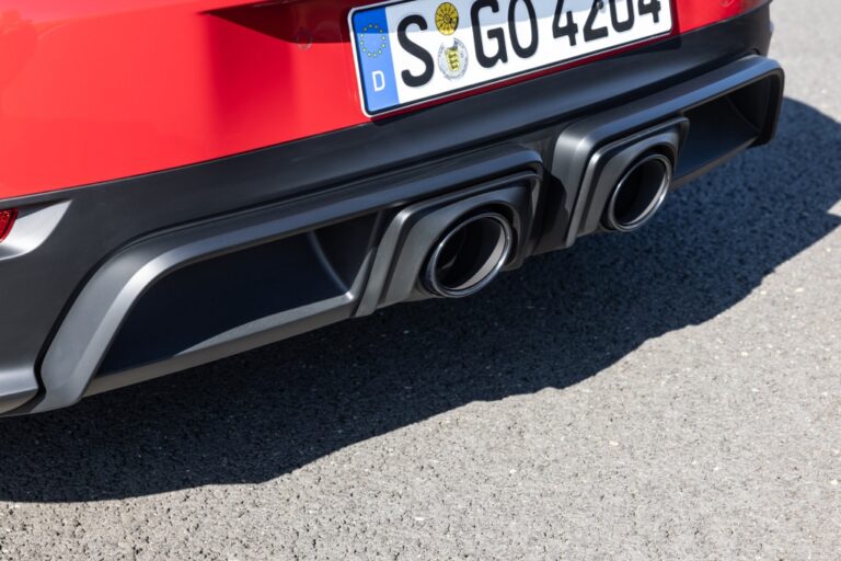 Nowo zaprojektowany pas świetlny z zintegrowanym łukiem i logo 'PORSCHE’ sprawia, że tył modelu 911 wydaje się głębszy i szerszy. Nowa tylna kratka z pięcioma finami po każdej stronie łączy się z tylnią szybą, tworząc graficzną jednostkę, która płynnie przechodzi w chowany spojler poniżej. Tablica rejestracyjna została umieszczona wyżej, a tylny zderzak ma wyraźną strukturę. Systemy wydechowe specyficzne dla modelu są elegancko zintegrowane ze wspaniałymi finami dyfuzora. Opcjonalnie dostępny jest sportowy układ wydechowy dla modeli 911 Carrera. Modele 911 Carrera GTS standardowo wyposażone są w sportowy układ wydechowy specyficzny dla GTS.