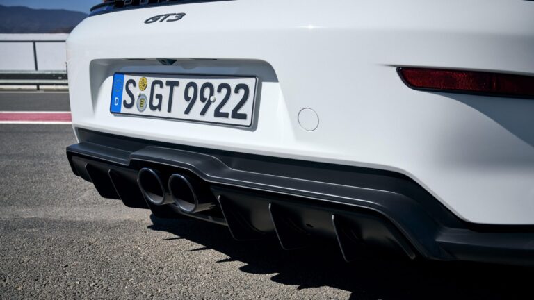 Z profilu, gotowy do wyścigów Porsche 911 GT3 z 2025 roku nie zdradzał swoich sekretów na pierwszy rzut oka. Standardowa wersja wyposażona była w aluminiowe felgi oraz stalowe hamulce. Ci, którzy zdecydowali się na pakiet Weissach, mogli również skorzystać z opcji tarcz węglowo-ceramicznych oraz felg magnezowych, co pozwoliło zaoszczędzić około dziewięciu kilogramów (20 lbs) na wadze pojazdu. Ten sam pakiet dodał również odsłonięte elementy włókna węglowego na masce i osłonach lusterek. W przeciwieństwie do pozostałych modeli 911, GT3 posiadał dach z włókna węglowego. Z tyłu, Porsche poprawiło aerodynamikę samochodu. Żaden element nie był tam tylko dla wyglądu, a wszystkie miały swoje znaczenie. Spojler typu ducktail na pokrywie silnika zwiększał docisk. Dodatkowo dostępne było ogromne skrzydło z włókna węglowego z niepomalowanymi elementami. W przeciwieństwie do poprzedniej wersji GT3, model 2025 roku miał nową kratkę chłodnicy na górnej stronie, z pojedynczym prostokątnym otworem ozdobionym siatką zamiast małych pionowych szczelin. Tylny zderzak również został odświeżony i miał prawdziwe otwory wydechowe za nadkolami, aby uwolnić powietrze uwięzione wewnątrz archwów kół. Pod zderzakiem znalazł się podwójny system wydechowy, starannie zintegrowany z pionowymi żebrami dyfuzora.