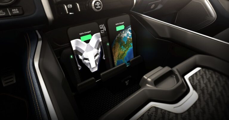 Port ładowania został starannie umieszczony na przednim błotniku po stronie kierowcy, a po podłączeniu jest podświetlany pulsującym światłem LED. Sygnał dźwiękowy informuje, że Ram 1500 REV jest podłączony i ładowanie się rozpoczęło. Port ładowania oferuje ładowanie AC poziomu 1 i 2 w górnej części oraz szybkie ładowanie DC w dolnej części ładowarki.