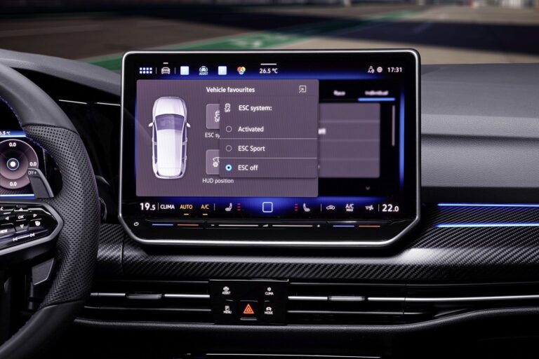 Kierowca może dezaktywować ESC za pomocą menu pojazdu. Przy uruchamianiu Golfa R i Golf R Variant, ESC zawsze jest aktywny jako pełny system. Następnie ESC można dostosować w dwóch etapach: w trybie ESC Sport progi ESC i progi ślizgania TCS są zwiększane, aby zmniejszyć intensywność interwencji. W trybie ESC Off, doświadczeni kierowcy mogą dodatkowo dezaktywować całkowicie ESC we wszystkich sytuacjach jazdy. Jednakże, Front Assist i funkcja wsparcia przeciwdziałania w nagłych wypadkach ponownie aktywują pełny system ESC.