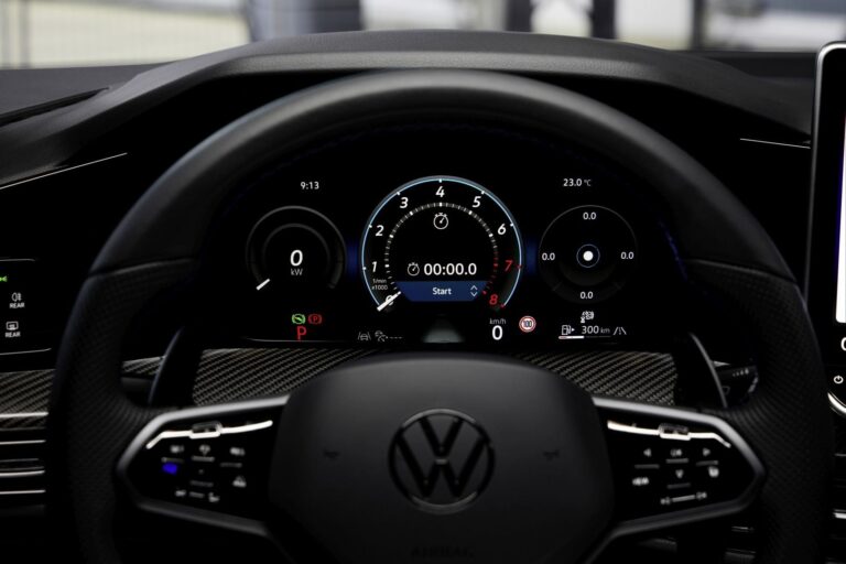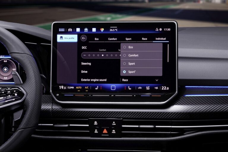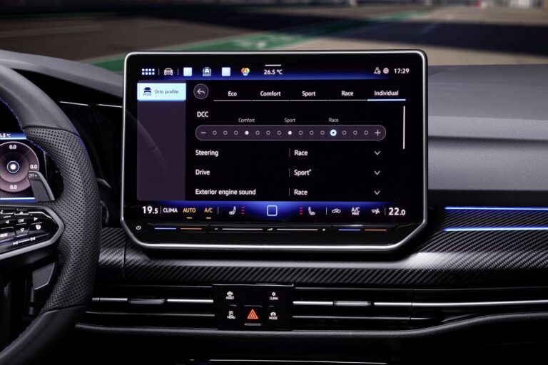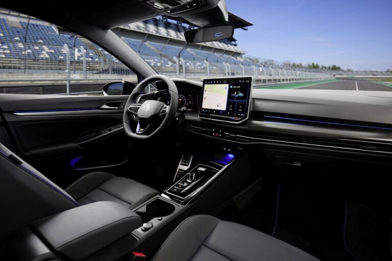 Nowe modele Golf R opierają się na ósmej generacji Golfa, która została znacznie zaktualizowana na początku 2024 roku. Reflektory matrycowe IQ.LIGHT LED to nowa cecha techniczna; po raz pierwszy oferują one wysokiej jakości światło główne z około 15 procent większym zasięgiem. Jak już wspomniano, wszystkie modele Golf R są wyposażone w całkowicie nowy system infotainment, obsługiwany za pomocą nowego, wolnostojącego ekranu dotykowego (32 cm/12,9 cala przekątnej). Dodatkowo zoptymalizowano obsługę wielofunkcyjnej kierownicy. Jak wcześniej, szczególną cechą jest niebieski przycisk R, który aktywuje różne profile jazdy, w tym ekskluzywny tryb Race. Aby zapobiec niezamierzonym aktywacjom trybu Race, próg wyzwalania przycisku R został zwiększony. Ustawienia prędkości, gdy aktywowany jest Adaptacyjny Tempomat (ACC), są teraz również bardziej intuicyjne: przycisk plus (+) na kierownicy zwiększa prędkość o 10 km/h przy każdym naciśnięciu, podczas gdy przycisk minus (-) zmniejsza prędkość o 10 km/h. Przycisk SET może być używany do zwiększania prędkości w przyrostach co 1 km/h, podczas gdy przycisk RES zmniejsza prędkość o 1 km/h przy każdym naciśnięciu.