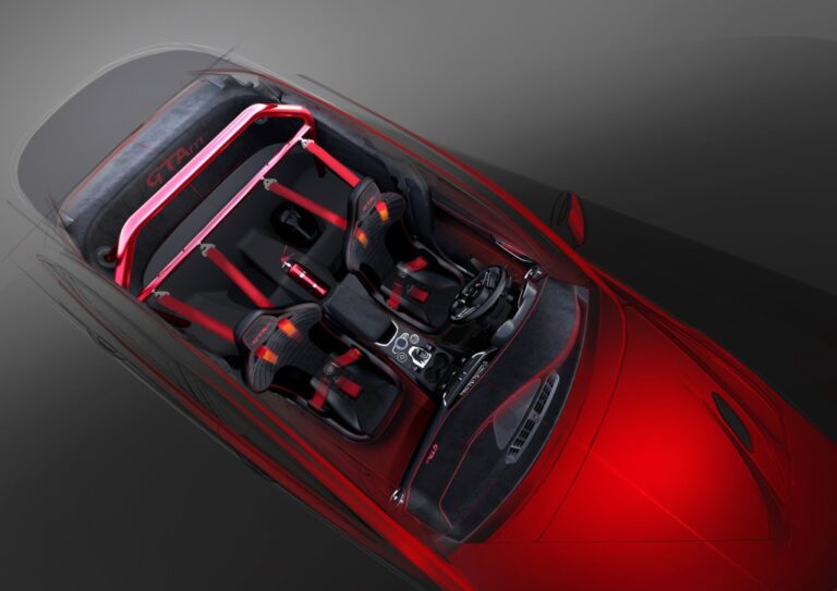 Wewnątrz samochodu wyróżnia się kilka nowych detali: wykończenia w 100% Alcantarą® na desce rozdzielczej, panelach drzwiowych, schowku, filarach bocznych i centralnym wykończeniu na siedzeniach. Alcantara® jest jeszcze bardziej rozbudowana w wersji GTAm, gdzie usunięto tylną kanapę, pozostawiając miejsce na w pełni wyściełany „basen”, w którym znajdują się specjalne formy zaprojektowane do trzymania kasków i gaśnicy. Nowe matowe wstawki z włókna węglowego nadają wnętrzu typową elegancję techniczną i estetyczną. W nowej wersji GTAm wnętrze jest unikalne, ponieważ zawiera roll bar, nie ma paneli drzwiowych ani tylnych siedzeń, a drzwi otwiera się za pomocą paska zamiast uchwytu, co jest kolejnym elementem zaczerpniętym ze świata wyścigów.