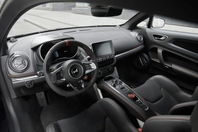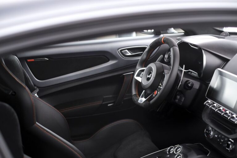 Wnętrze A110 łączy minimalistyczny, lekki design z przyjemną, komfortową pozycją za kierownicą. Wysokiej jakości materiały – gładka skórzana tapicerka naturalnej struktury, aluminium strukturalne, włókno węglowe – zapewniają satysfakcjonujące doświadczenie zarówno dla kierowcy, jak i pasażera.