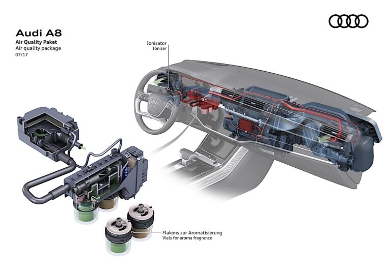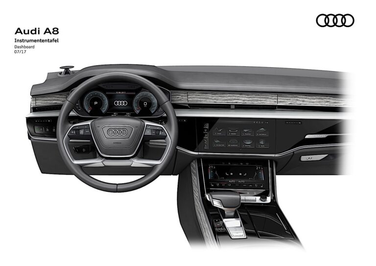 Wewnątrz dużego sedana linie płyną elegancko, tworząc wyraźne, poziomo zorientowane objętości. Akcentują wolność, jaką nowy A8 oferuje swoim pasażerom. Elementy w rzeźbiarszym panelu instrumentów są dostępne w wyborze forniru drewnianego lub wykończenia fortepianowego i tworzą obwódkę – duży łuk biegnący przez wykończenia drzwi i do tyłu. W tej strefie znajdują się wloty powietrza, które są ukryte za żaluzjami, gdy są nieaktywne. Jeśli automatyczna klimatyzacja jest ustawiona bezpośrednio na wnętrze, żaluzje są elektrycznie przesuwane do góry, a wloty powietrza wysuwają się na kilka centymetrów.