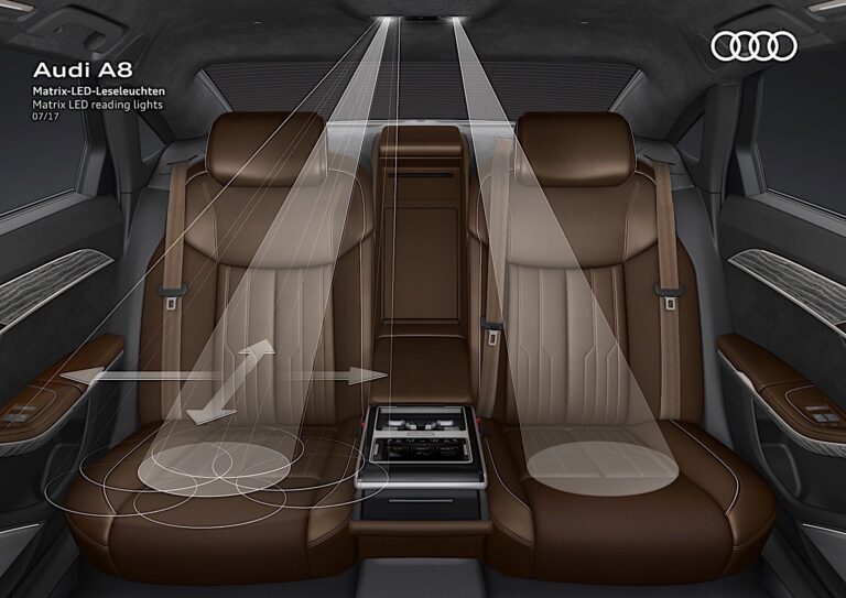 Opcjonalnie, dwie prowadnice świetlne LED na tunelu centralnym, panelu instrumentów i w drzwiach tworzą odpowiednią atmosferę świetlną we wnętrzu. Tworzą one oświetlenie konturowe i ambientowe z oddzielną regulacją jasności i koloru, elegancko akcentując linie designu. W A8 L tylne oparcia komfortowych, spersonalizowanych foteli przednich również zawierają taśmę świetlną konturową. Nowo opracowane lampki do czytania Matrix LED, każda z siedmioma LED-ami, zapewniają optymalne oświetlenie. Pasażer może precyzyjnie kontrolować jasność, rozmiar i skupienie stożka światła za pomocą zdalnego sterowania tylnego siedzenia.