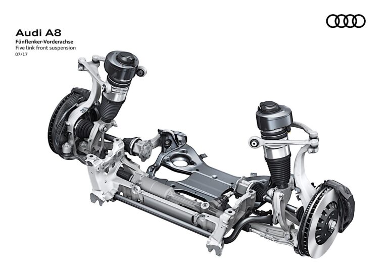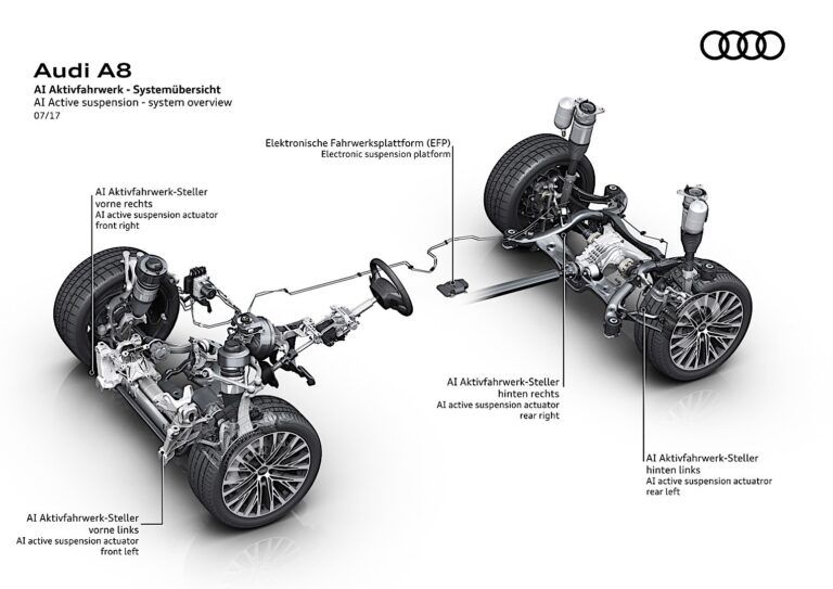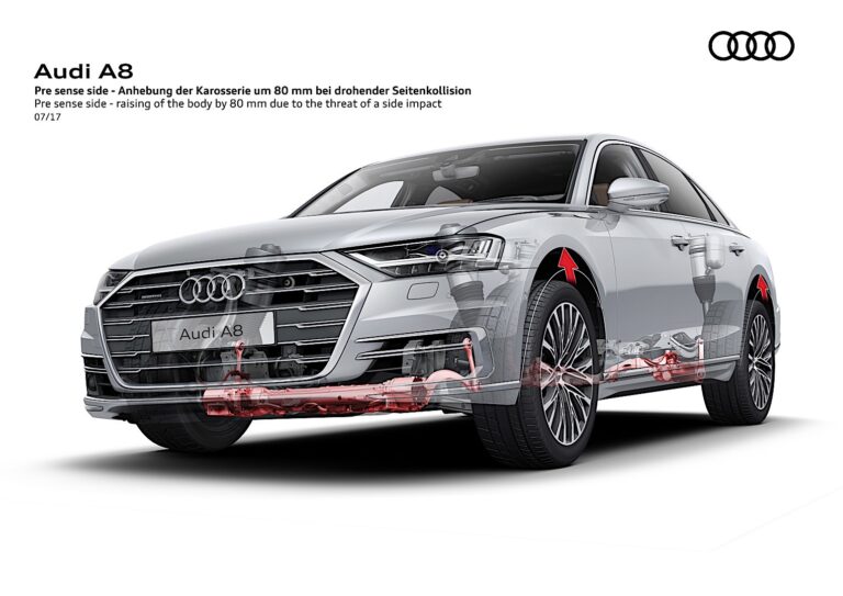 Nową cechą aktywnego zawieszenia jest możliwość indywidualnego zwiększenia lub zmniejszenia obciążenia na wszystkich czterech kołach, dla aktywnej kontroli nadwozia w każdej sytuacji jazdy. Wprowadza to nowy wymiar elastyczności: Jeśli kierowca wybierze tryb dynamiczny w systemie Audi drive select, nowe A8 staje się zwinny sportowym samochodem – skręca mocno, a jego kąty przechyłu są mniej więcej o połowę mniejsze w porównaniu do normalnego stanu. Z drugiej strony, w trybie komfortowym nadwozie porusza się gładko, nawet na nierównych nawierzchniach.