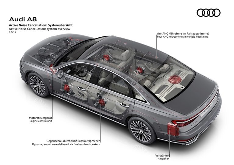 Pod obciążeniem, 4.0 TFSI wydaje charakterystyczny sportowy dźwięk, wolny od zakłóceń. W przypadku silnika benzynowego V8, e-tron i W12, system aktywnej redukcji hałasu (ANC) eliminuje te zakłócenia. System wysyła specyficzne przeciwzakłócenia do głośników systemu dźwiękowego. Dodatkowo, silniki V8, W12 oraz 3.0 TDI są wyposażone w aktywne mocowania silnika, które hamują przekazywanie drgań do nadwozia pojazdu. One także generują przeciwfalowe impulsy – ich działanie jest szczególnie wyraźne podczas pracy na biegu jałowym.