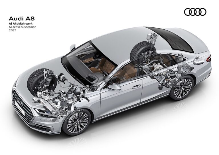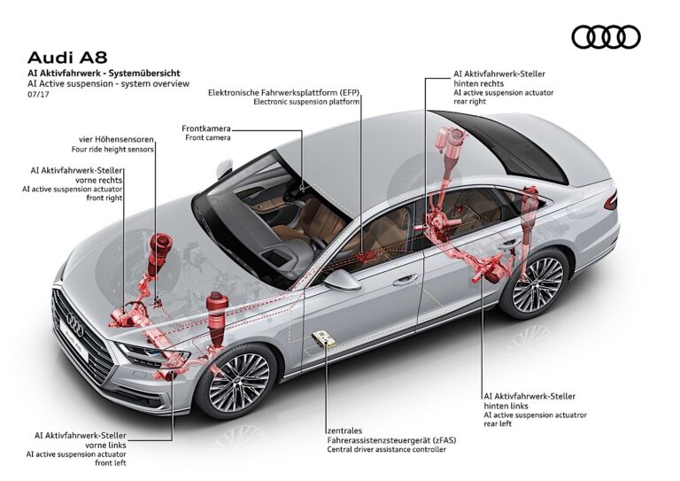Adaptacyjne zawieszenie pneumatyczne już daje A8 szeroki wachlarz charakterystyk operacyjnych, od komfortu jazdy po sportowe prowadzenie. Wrażenie to jest jeszcze bardziej podkreślone dzięki Audi AI aktywnemu zawieszeniu, które będzie dostępne od premiery dla V6 TFSI oraz dwóch wersji V8. Jest to standardowy element w W12. Audi AI aktywne zawieszenie to w pełni aktywne, elektromechanicznie sterowane zawieszenie. Dla każdego koła znajduje się jeden silnik elektryczny zasilany przez 48-woltowy system elektryczny. W każdym przypadku znajduje się również przekładnia, rurka obrotowa z tytanową belką i dźwignia, która wywiera do 1 100 newtonometrów (811,3 lb-ft) na zawieszenie za pomocą pręta sprzęgającego.