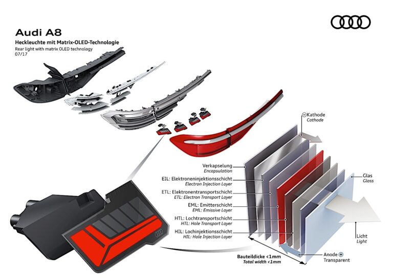 Razem z reflektorami high-end, Audi dostarcza tylne światła OLED, które emitują niezwykle gładkie światło. W każdym module znajdują się cztery ultra-cienkie OLED-y, podzielone na cztery indywidualnie kontrolowane segmenty. Dwa z każdej strony tworzą kanciaste światła tylne, a pozostałe dwa działają jako światła hamowania.