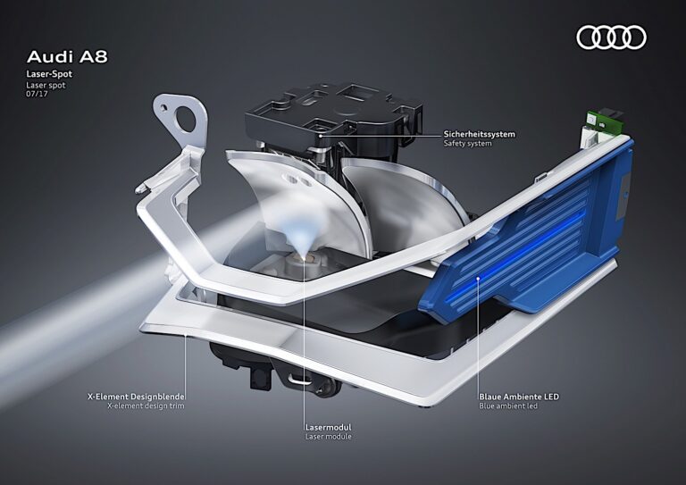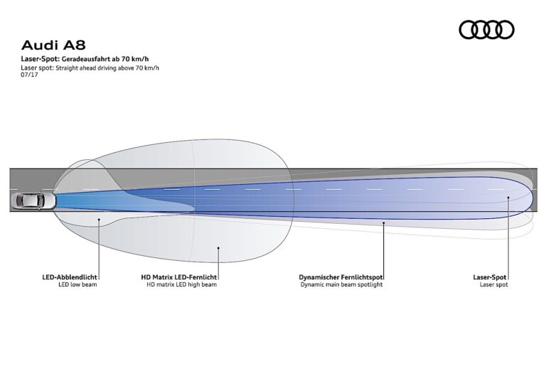 Audi prowadzi prym w technologii i designie oświetlenia. W nowym A8 technologie współdziałają inteligentnie z otoczeniem. Na przykład, oświetlenie laserowe Audi jest stosowane tutaj po raz pierwszy z reflektorami HD Matrix LED. Punkt laserowy jest identyfikowany przez przesłonę w kształcie X i jest również akcentowany niebieskim oświetleniem ambientowym. Światła dzienne z pionowymi segmentami podkreślają techniczną elegancję reflektorów. Punkt laserowy aktywowany jest przy prędkości 70 km/h (43,5 mph) i podwaja zasięg świateł drogowych.