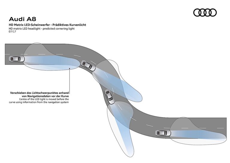 Światło zakrętu jest wytwarzane poprzez przesunięcie punktu ogniskowego światła. Wykorzystuje dane nawigacyjne, aby oświetlić zakręt tuż przed skrętem. Światło na skrzyżowaniu również włącza się przewidywalnie tuż przed osiągnięciem skrzyżowania. Segmentowane światło kierunkowskazu włącza się także dynamicznie w trzech etapach, aż do maksymalnego kąta 90°. Z wszystkimi funkcjami, w tym dynamicznymi kierunkowskazami, każdy reflektor HD Matrix LED zawiera 138 LED-ów i jedną wysokowydajną diodę laserową. Innowacyjne automatyczne oświetlenie zapobiega niewłaściwemu działaniu i jest sterowane z nowego modułu przełącznika świetlnego z czujnikami zbliżeniowymi i powierzchnią dotykową.