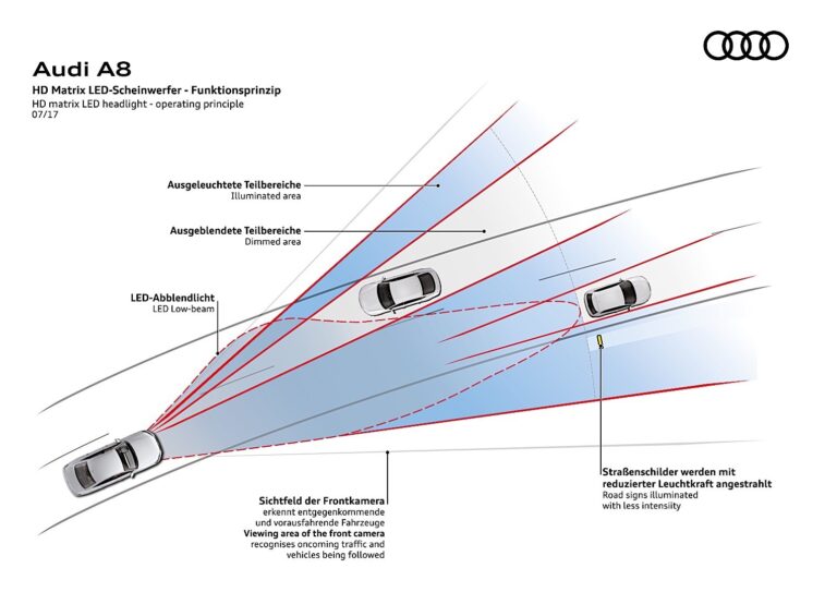 Każda jednostka reflektorów LED HD Matrix w trybie długim składa się z 32 małych, indywidualnie sterowanych diod emitujących światło, które projektują światło w dwóch liniach. Ta nowa konfiguracja zapewnia, że A8 zapewnia jeszcze bardziej dynamiczne i precyzyjne oświetlenie w połączeniu z reflektorami LED w trybie krótkim z zmiennym sterowaniem. Stożek światła wyklucza wyłącznie innych użytkowników drogi, aby ich nie oślepiać. Precyzyjne sterowanie światłami HD Matrix LED opiera się na danych dostarczanych przez przednią kamerę.