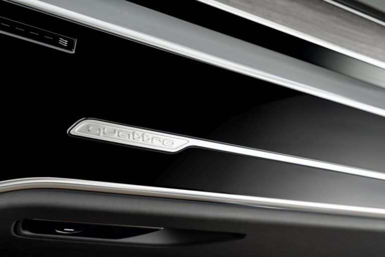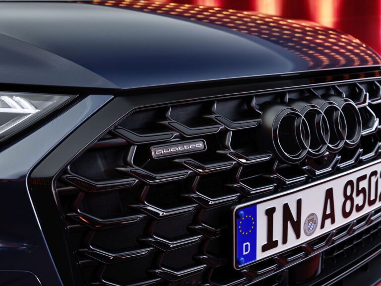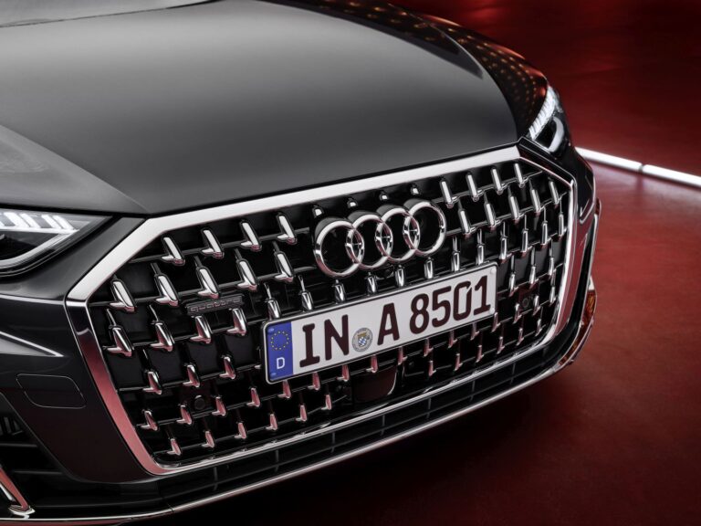 Audi A8 to sedan, który reprezentuje status i emanuje autorytetem – teraz, po modernizacji, jego wygląd zewnętrzny jest jeszcze bardziej reprezentacyjny, pewny siebie i sportowy. Podstawa grilla Singleframe jest teraz szersza, a krawędzie chromu powiększają się od dołu do góry, ozdabiając siatkę. Boczny wlot powietrza jest bardziej pionowy i stylizowany na świeżo, podobnie jak reflektory, których dolna krawędź na zewnątrz tworzy wyraźny kontur. Podsumowując, nowo zaprojektowane i precyzyjnie zaaranżowane elementy designu w przedniej części znacząco zwiększają obecność i autorytet A8, ostrząc profil flagowego modelu marki.
