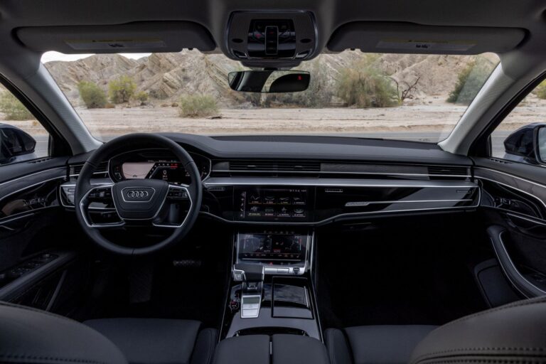 Wnętrze A8 było tak komfortowe, jak tylko może być niemiecka limuzyna. Fotele z maksymalnie 18 poduszkami oferowały różnorodne funkcje masażu. Zestaw 10,1-calowych telewizorów HD mógł zapewnić rozrywkę pasażerom tylnych siedzeń, podczas gdy dyskretne Matrix-LED zapewniało subtelne lub jaśniejsze oświetlenie. Z przodu, producent zrezygnował z klasycznych wskaźników z wyświetlaczami. Audi Virtual Cockpit zastąpiło analogowe tarcze na desce rozdzielczej, a na środkowej konsoli wyświetlacz infotainment oraz dodatkowy panel sterowania z haptycznym ekranem dotykowym zapewniały dalsze kontrole nad MMI, ustawieniami klimatyzacji czy opcjami jazdy.