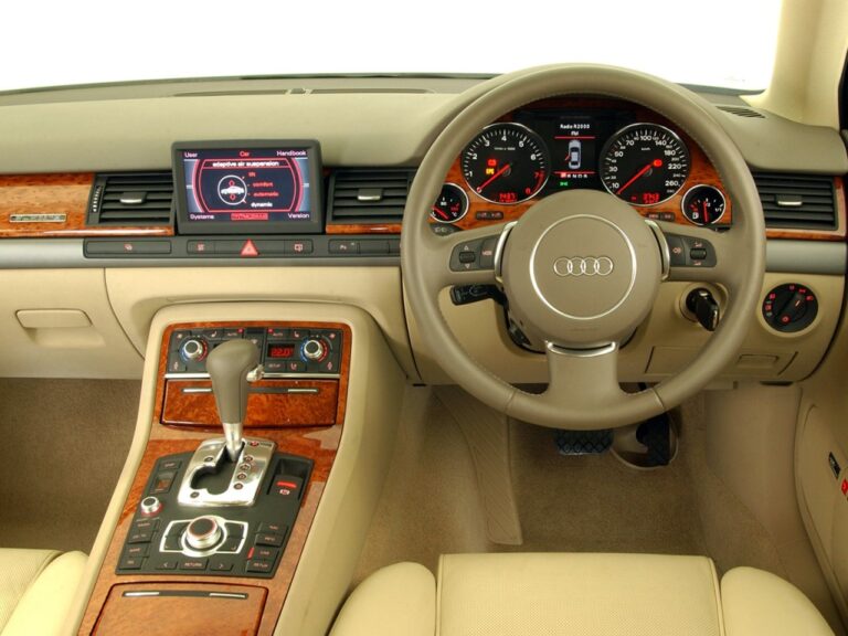 Wnętrze wypełniały cztery modele designu, spośród których wybrano jeden, aby reprezentował flagowy model firmy. Mimo że był to pojazd klasy luksusowej, producent skupił się na obszarze kierowcy, instalując wszystkie kontrolki blisko fotela kierowcy. Z tyłu, A8 oferowało wybór między profilowanym zestawem dla dwóch osób a dwoma indywidualnymi fotelami, w zależności od opcji. Jedną z najważniejszych cech samochodu był system MMI (Multi Media Interface), który odpowiadał systemowi BMW iDrive z serii 7. Był to także pierwszy model Audi z mapami opartymi na DVD.