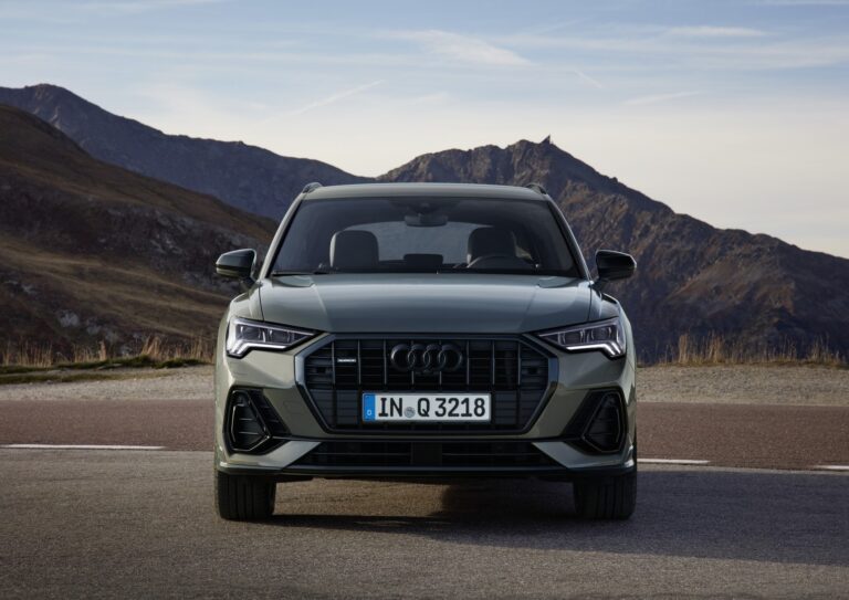 Nowy Audi Q3 wygląda znacznie sportowiej niż jego poprzednik. Kryształowa osłona chłodnicy w kształcie ośmiokąta oraz duże wloty powietrza z przodu nadają męski wygląd. Osiem pionowych listew dzieli charakterystyczną kratkę chłodnicy, podkreślając cechy SUV-a. Reflektory są wąskie i mają kształt klina, a Audi oferuje je w trzech wersjach, wszystkie z technologią LED. Najwyższa wersja to reflektory Matrix LED, których adaptacyjny długi snop światła inteligentnie oświetla drogę.