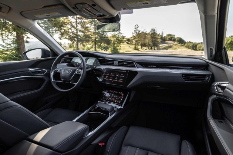 Wnętrze Q8 e-tron charakteryzowało się luksusową kabiną pokrytą mikrofibrą Dynamica wykonaną z materiałów pochodzących z recyklingu. Z przodu producent zamontował fotele z wzmocnieniem dla całej gamy, z opcją sportowych foteli pokrytych skórą. Jak każdy inny nowoczesny pojazd ze swojej epoki, Q8 e-tron posiadał cyfrową tablicę rozdzielczą. Na szczycie centralnego panelu znalazł się ekran jednostki infotainment MMI, a poniżej dotykowy panel do sterowania klimatyzacją i innymi funkcjami pojazdu. Z tyłu zamontowano ławkę dzieloną w proporcjach 40/20/40, dostosowaną dla trzech pasażerów.