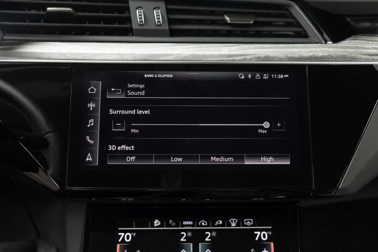 Jak wszystkie modele Audi w klasie luksusowej, Q8 e-tron wykorzystuje system obsługi MMI touch response. Dwa duże, wysokorozdzielcze wyświetlacze – górny o przekątnej 10,1 cala i dolny o przekątnej 8,6 cala – zastępują niemal wszystkie konwencjonalne przełączniki i pokrętła. Poza obsługą dwiema wyświetlaczami dotykowymi, wiele funkcji można aktywować za pomocą naturalnego sterowania głosowego. Cyfrowy wyświetlacz i koncepcja obsługi w Audi Q8 e-tron są uzupełnione standardowym Audi wirtualnym kokpitem o rozdzielczości pełnej HD. Specyficzne grafiki przedstawiają wszystkie istotne aspekty jazdy elektrycznej, od mocy ładowania po zasięg. Na życzenie można dodać wyświetlacz typu heads-up. Na rynku niemieckim Audi Q8 e-tron będzie standardowo wyposażony w MMI Navigation plus. Jego centrum multimedialne obsługuje standard szybkiej transmisji danych LTE Advanced i ma zintegrowany hotspot WiFi dla urządzeń mobilnych pasażerów. System nawigacji inteligentnie proponuje destynacje na podstawie wcześniej pokonanych tras. Oprócz tego pakiet Audi connect Navigation i Infotainment zawiera usługi car-to-X.