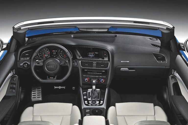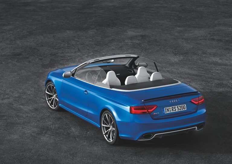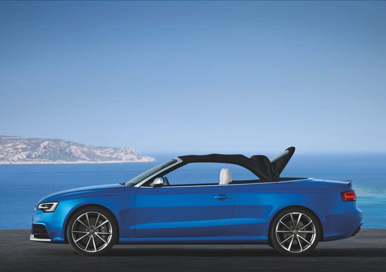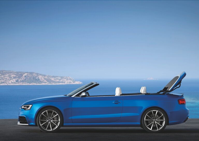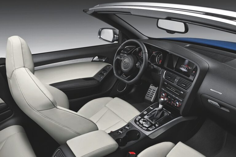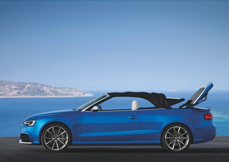 Lekka tekstylna osłona dachu rozciąga się nad wnętrzem 4.65 metrów (15.26 ft) Audi RS5 Cabriolet jak niski, zakrzywiony domek; warstwa pianki w dachu zapewnia wysoki komfort akustyczny. Naciśnięcie przycisku umożliwia otwarcie lub zamknięcie dachu w 15 lub 17 sekund, odpowiednio – dach składa się w zaledwie 60 litrów (2.12 cubic ft) z 380 litrów (13.42 cubic ft) bagażnika, gdy jest opuszczony. Składane oparcia tylne siedzeń można indywidualnie złożyć, aby zapewnić dużą przestrzeń ładunkową.