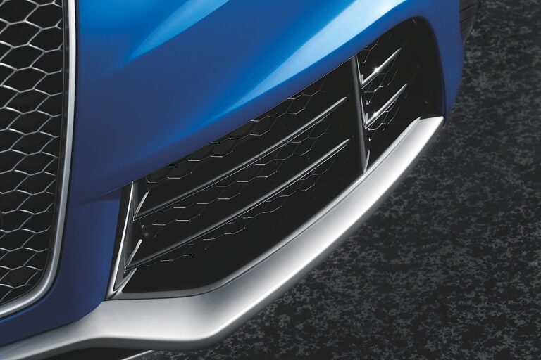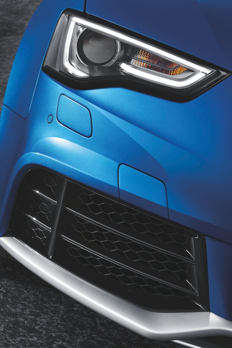 Zwężająca się kratka Singleframe dominuje na przedzie, jej boczne krawędzie wychodzą poza maskę. Ramka w matowym wyglądzie aluminium otacza kratkę, a wkładka o strukturze plastra miodu z logo RS5 błyszczy w antracycie. W wedge-shaped reflektorach z falującymi dolnymi krawędziami wzrok przyciąga zewnętrzny kształt pojazdu, tworząc wizualne wrażenie większej szerokości. Lampy xenon plus wewnątrz reflektorów otaczają paski LED, które tworzą światła dzienne.