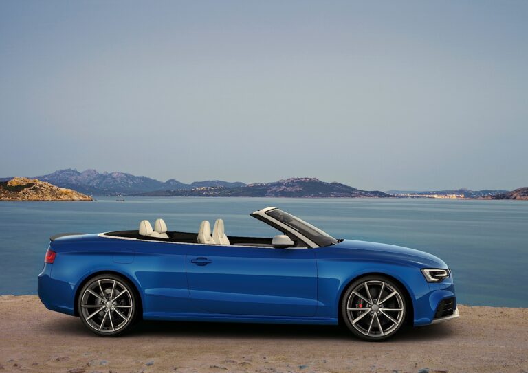 Anodowany pasek aluminium na ramie szyby, klasyczny element wszystkich kabrioletów Audi, nadaje pojazdowi stylowy akcent. Dekoracyjne listwy na kanałach okiennych i pokrywie bagażnika są wykonane z tego samego materiału, a obudowy lusterek drzwi są wykończone w matowym aluminium. Ostro zarysowane, napięte powierzchnie i ostre kontury charakteryzują linie boczne – dynamiczna linia biegnie wzdłuż progów, a płynąca linia tornado poniżej okien. Szerokie ramiona, potężne nadkola, duże koła i kanciaste wykończenia progowe to świadectwo surowej mocy Audi RS5 Cabriolet.