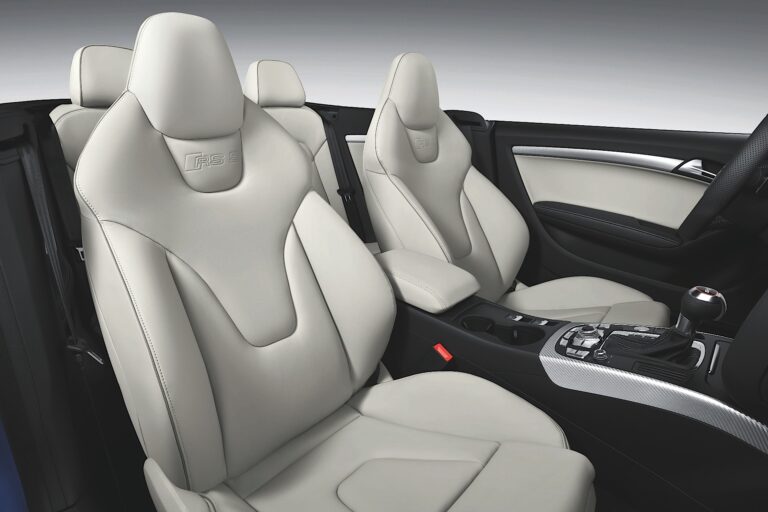 Skórzana, pokryta wielofunkcyjna sportowa kierownica w Audi RS5 Cabriolet ma spłaszczony spód; czarne zegary kontrastują z białymi cyframi. System informacji dla kierowcy może wyświetlać menu z czasomierzem i wskaźnikiem temperatury oleju. Fotele sportowe S z zintegrowanymi zagłówkami mają regulację elektryczną; są obite skórą i Alcantarą, dostępna jest również opcja skórzanej wykończenia Fine Nappa. Skóra jest pigmentowana, aby zapobiec nagrzewaniu się pod wpływem światła słonecznego.