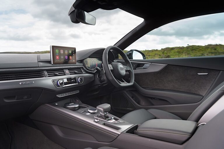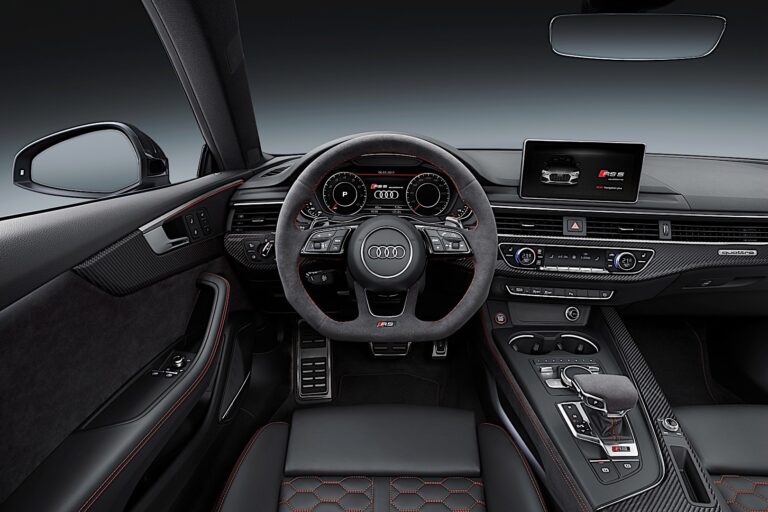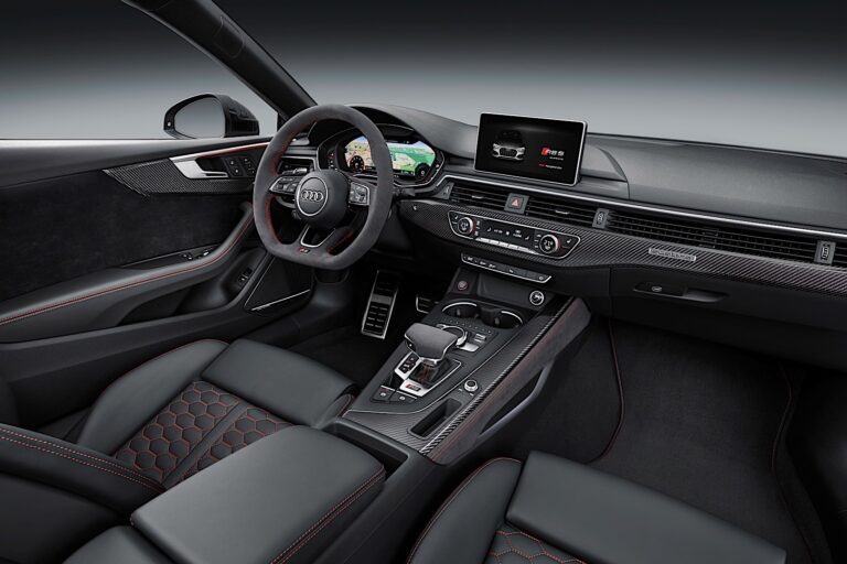 Wnętrze w czerni charakteryzuje się bardzo wysokim standardem i sportowym wyposażeniem. Fotele sportowe RS – dostępne opcjonalnie w finezyjnej skórze Nappa z wzorem plastra miodu – oraz płaskie dno sportowego wielofunkcyjnego koła kierownicy RS podkreślają charakter wysokowydajnego Coupe we wnętrzu. Obwód koła kierownicy zdobi insignia RS, podobnie jak oparcia przednich siedzeń oraz gałka zmiany biegów. Specjalne wyświetlacze RS w wirtualnym kokpicie Audi dostarczają informacji o ciśnieniu w oponach, momencie obrotowym i g-forcach. Wskaźnik zmiany biegów informuje kierowcę o osiągnięciu limitu obrotów. Pakiet designu RS wprowadza sportowy kontrastowy kolor czerwony na konsolę centralną oraz na podłokietniki, pasy bezpieczeństwa i dywaniki z logo RS. Koło kierownicy, dźwignia zmiany biegów i podkładki na kolana są pokryte Alcantarą. Pakiet designu Sonoma green od Audi exclusive wzbogaca wnętrze o odpowiednio dobrane kontrastowe przeszycia – idealnie komponujące się z nowym, ekskluzywnym kolorem nadwozia.