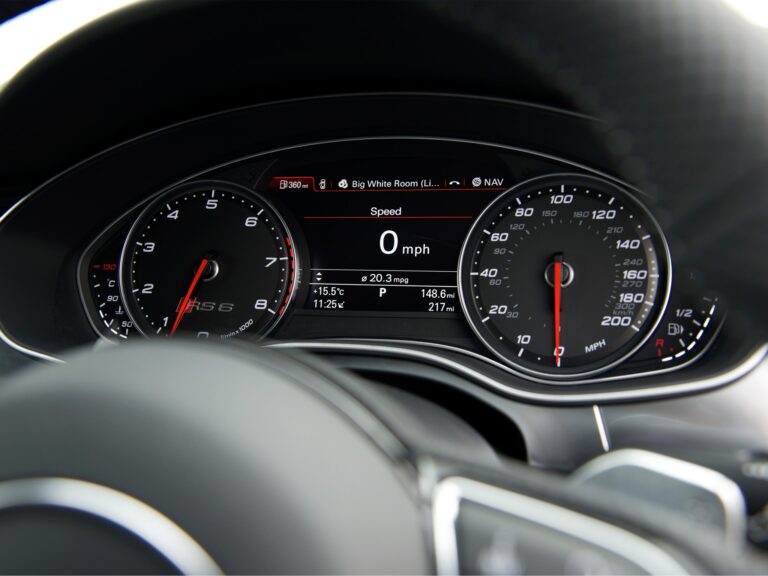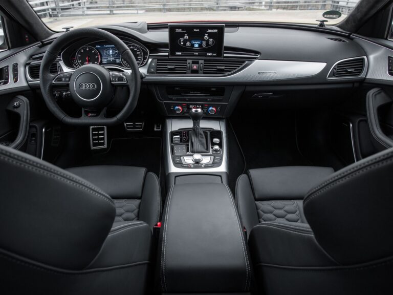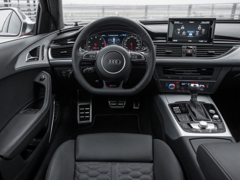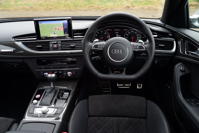 Kokpit nowego Audi RS6 Avant jest skierowany ku kierowcy. Wskaźniki mają czarne tarcze, białe diale i czerwone wskazówki. Logotypy RS zdobią klucz, płaską, trójramienną, multifunkcyjną sportową kierownicę skórzaną, podświetlane listwy progowe, obrotomierz oraz duży kolorowy wyświetlacz systemu informacyjnego kierowcy. Dźwignia zmiany biegów ma specyficzny design, a łopatki zmiany biegów mają aluminiowy wygląd.