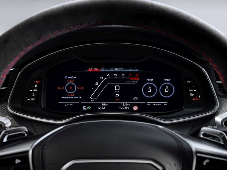 Oczyszczony wygląd z sportowymi akcentami to kluczowe elementy stylistyczne wnętrza nowego Audi RS7 Sportback. Podobnie jak w przypadku designu zewnętrznego, język projektowania łączy napięte, smukłe powierzchnie z wyraźnie zdefiniowanymi konturami. Jest dużo przestrzeni dla kierowcy i pasażera, a architektura wnętrza tworzy płynne przejście do futurystycznego interfejsu użytkownika. Górny wyświetlacz MMI touch response jest osadzony w czarnej architekturze w sposób, który sprawia, że niemal niemożliwe jest dostrzec, gdzie kończy się wyświetlacz, a zaczynają otoczenie. Kierowca może skorzystać z górnego wyświetlacza monitorowania RS, aby uzyskać przegląd temperatur komponentów systemu napędowego, maksymalnych sił g oraz informacji dotyczących ciśnienia i temperatury opon.