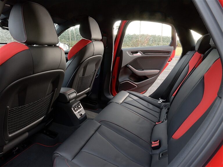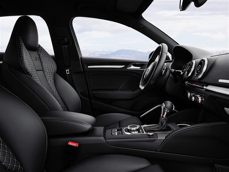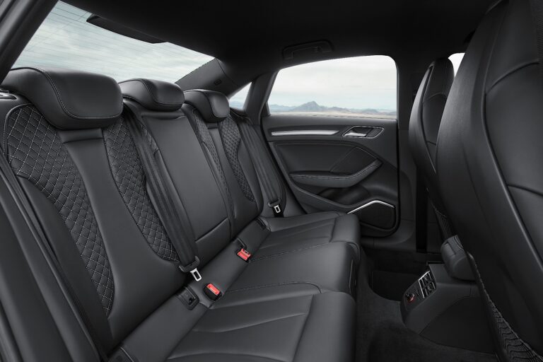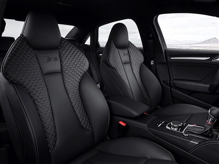 Przednie sportowe siedzenia zapewniają optymalne podparcie i wsparcie. Siedziska można wydłużać, a logo S3 jest wytłoczone w oparciach. Boczne podparcia są standardowo pokryte skórą Pearl Nappa, a środkowe części siedziska pokryte są materiałem. Dostępne są również kombinacje Alcantary i skóry Pearl Nappa lub Fine Nappa z Velvet. Kontrastowe przeszycia stanowią akcenty. Audi oferuje opcjonalne sportowe siedzenia S z wbudowanymi zagłówkami i wkładkami naramiennymi z diamentowym pikowaniem. Dwukolorowy wybór wzornictwa Audi w kolorze czarnym/czerwonym parade to ekskluzywna alternatywa.