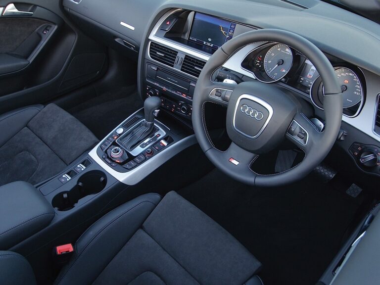 Wewnątrz, elektrycznie regulowane sportowe fotele pokryte Alcantarą i skórą oraz szczotkowane aluminiowe wstawki podkreślają wysoką jakość i dynamiczny styl modelu premium. Skale wskaźników mają subtelny szary kolor; wskazówki są podświetlane na biało. Kolorowy system informacji dla kierowcy jest standardem. Pady zmiany biegów w aluminiowym wyglądzie oraz centralna podłokietnik dopełniają program charakterystycznych cech. Logotypy S5 zdobią osłony progów, kluczyk, skórzane wielofunkcyjne koło kierownicy oraz wskaźniki.