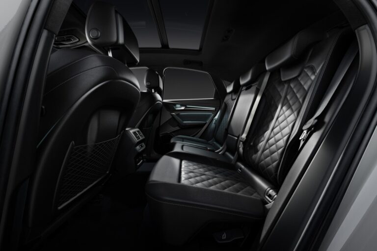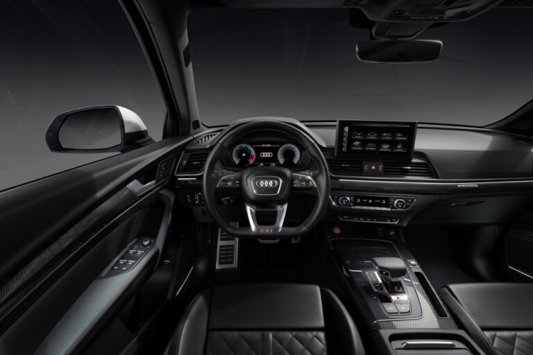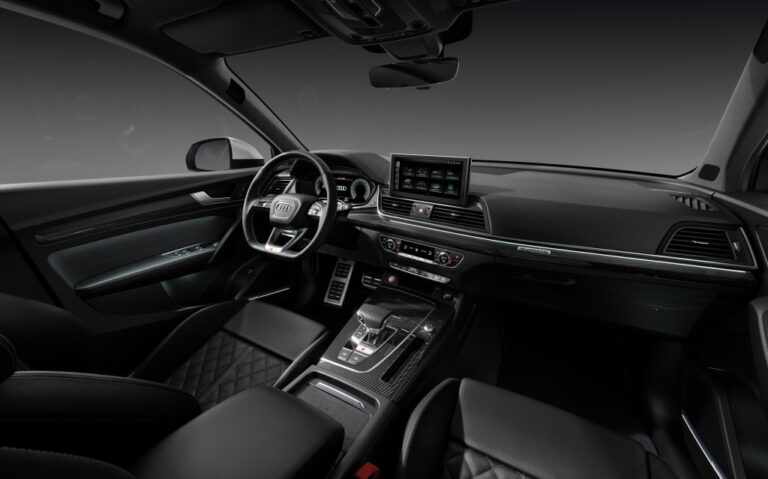Wnętrze Audi SQ5 Sportback TDI zaprojektowane jest w kolorach czarnym lub ciemnoszarym, a podświetlane aluminiowe listwy progowe ozdobione są emblemami S. Do wyboru są trzy opcje tapicerki dla elektrycznie regulowanych sportowych foteli z wytłoczonymi emblematami S. Kontrastowe przeszycia zdobią fotele i kierownicę; funkcja masażu oraz wentylacja foteli są dostępne na życzenie. Szczotkowane aluminium jest standardem dla wstawek, opcjonalnie dostępne są dwa wzory z włókna węglowego i wykończenie fortepianowe.