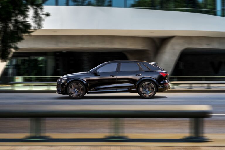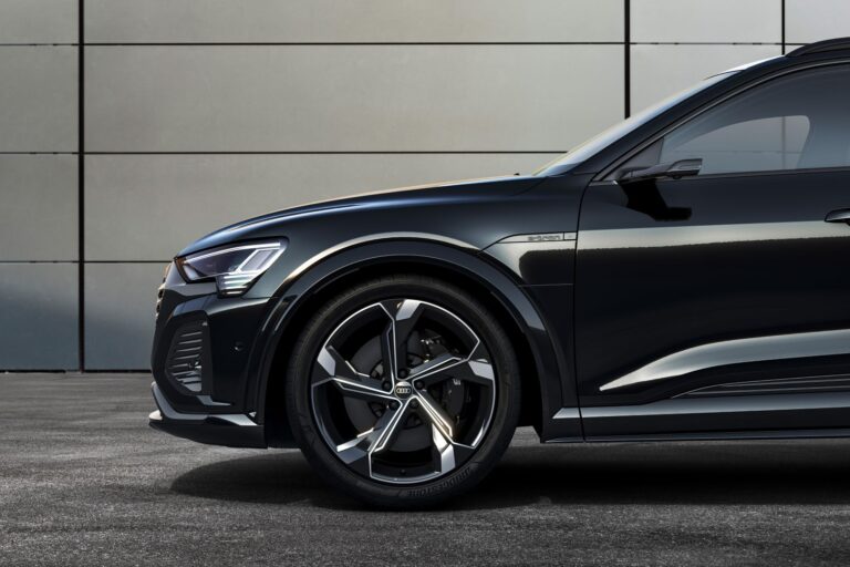 Samochód ma agresywną sylwetkę, z obniżonym nadwoziem w porównaniu do standardowego modelu Q8 e-tron. Przedni zderzak wyróżnia się tym samym podpisem świetlnym LED, który podkreśla szerokość auta. Ponadto, 3D kratka ma stylizowany wzór plastra miodu. Bocznie umieszczone wloty w dolnym zderzaku mają taki sam czteroszczelinowy design jak światła dzienne z dolnej części reflektorów. Z profilu, wyraźnie zaznaczone nadkola, 22-calowe aluminiowe felgi oraz boczne progi nadają niemieckiemu crossoverowi jeszcze sportowniejszy wygląd.