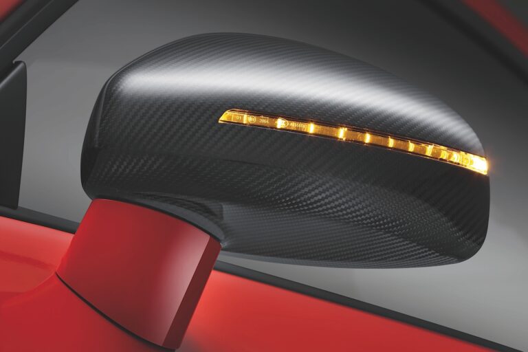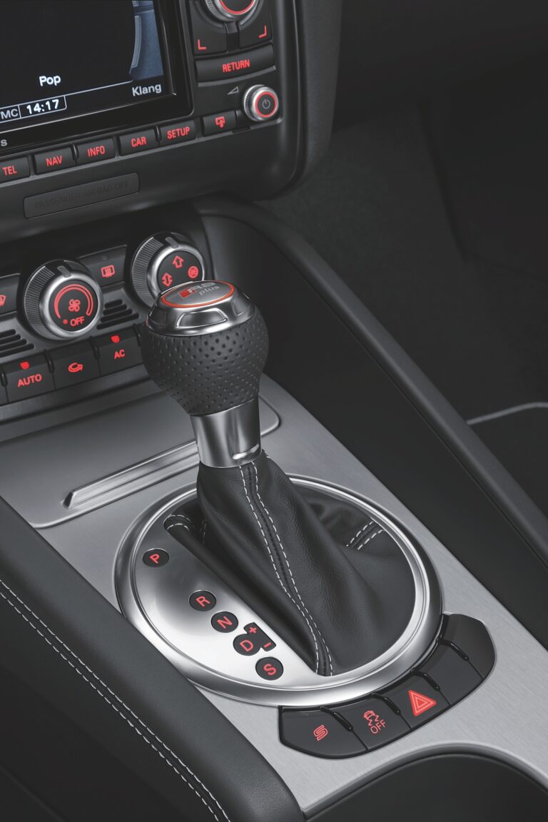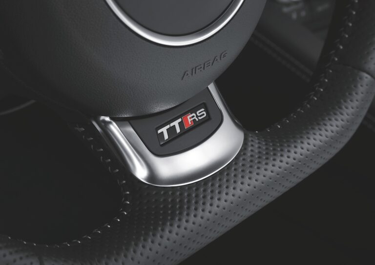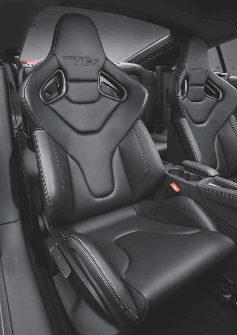 Grille chłodnicy Singleframe wizualnie wyróżnia Audi TT RS plus: jego siatka w diamentowym wzorze jest wykończona w wysoko polerowanym antracycie, a ramka ma matowe wykończenie w stylu aluminium. Obudowy zewnętrznych lusterek wykonane są z tworzywa wzmocnionego włóknem węglowym (CFRP). Podwójny sportowy układ wydechowy ma czarne owalne końcówki. Klapka dźwiękowa dodatkowo potęguje brzmienie silnika. Pakiet Carbon nadaje komorze silnikowej bardziej ekskluzywny wygląd. Pokrętło na dźwigni zmiany biegów ma obręcz wykończoną w stylu aluminium oraz emblemat TT RS plus.