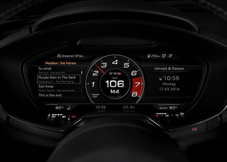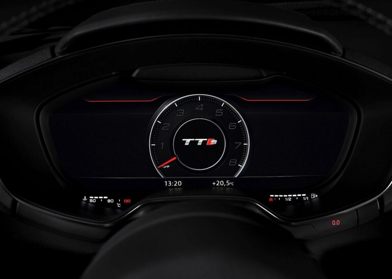Audi wirtualny kokpit – cyfrowa tablica przyrządów z wysoce szczegółową, wszechstronną grafiką – zastępuje analogowe przyrządy i monitor MMI w nowym TT. Kierowca może przełączać 12,3-calowy, całkowicie cyfrowy wyświetlacz między dwoma różnymi trybami widoku. Klasyczna konfiguracja przedstawia prędkościomierz i obrotomierz na pierwszym planie. W trybie Infotainment takie aspekty jak mapa nawigacyjna przesuwają się na pierwszy plan, a tarcze instrumentów są pokazywane w mniejszych rozmiarach. TTS zawiera widok, który jasno ilustruje bliskie związki z wyścigami i umieszcza obrotomierz na pierwszym planie.