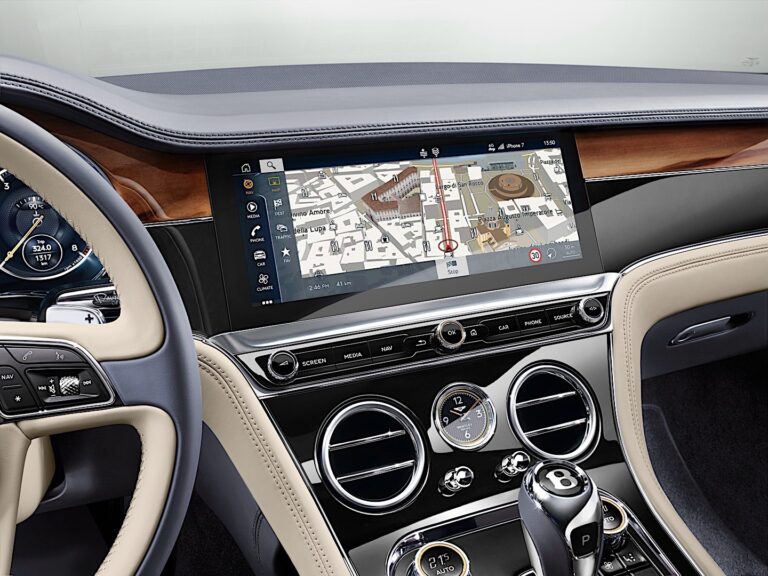Nowy Bentley Continental GT pokazuje również znaczące ewolucje w unikalnym wykorzystaniu technologii przez Bentleya. Zaawansowany, w pełni cyfrowy, skoncentrowany na kierowcy panel instrumentów oraz obracający wyświetlacz Bentley’a to tylko niektóre z innowacji. Ten ostatni ma imponujący ekran dotykowy o przekątnej 12,3″ zamknięty w trójstronnej jednostce, która obraca okleinę, aby odsłonić ekran dotykowy oraz trzy eleganckie analogowe wskaźniki.