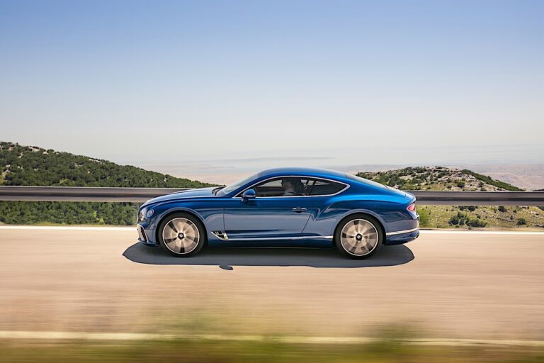 Profil Bentley’a Continental GT jest dłuższy i niższy, częściowo dzięki usytuowaniu przednich kół 135 mm dalej na przód, co z kolei pozwala na wydłużenie maski oraz obniżenie przodu. Jednak kluczowe linie charakterystyczne oryginalnego Continental wciąż dominują, a „linia mocy” biegnie od reflektorów do muskularnego tylnego nadkola.