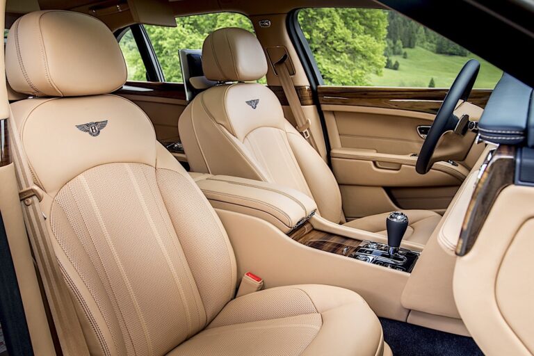 Otwierając drzwi flagowca Bentley’a, ujawnia się podstawy z solidnego orzecha, wiśni lub dębu, które są widocznie widoczne w desce rozdzielczej i pokryte wyborem 13 różnych fornirów.