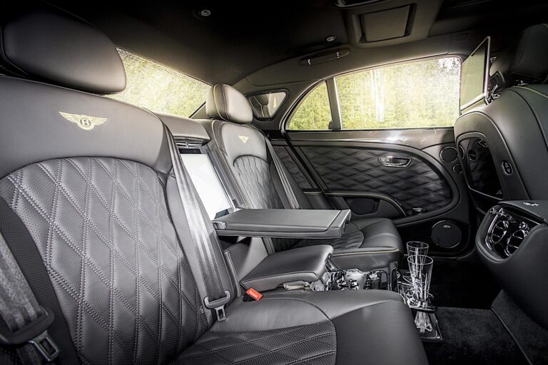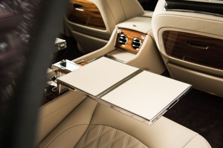 Aby maksymalnie wykorzystać dodatkowe miejsce na nogi z tyłu, Bentley opracował elektroniczne podnóżki w stylu lotniczym, które są zintegrowane z podstawami dwóch tylnych siedzeń. Dodatkowo, elegancko zaprojektowana konsola dzieli dwa tylne fotele w Mulsanne z przedłużonym rozstawem osi. Jego ozdobny i funkcjonalny charakter wykonany jest z materiałów największej jakości – ręcznie wykonane fornir, metal, szkło i skóra – a także zawiera praktyczne cechy, takie jak porty USB, uchwyty na długopisy, kubki oraz przestrzeń do przechowywania przykrytą szkłem.
