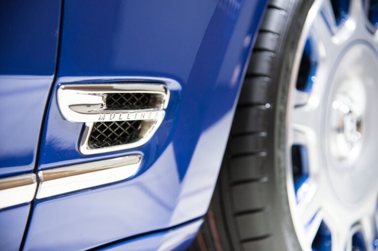 Detale w jasnym chromie kontynuują się po bokach Mulsanne’a z nowym wlotem powietrza w kształcie litery B, wkomponowanym w dolną część błotnika.
