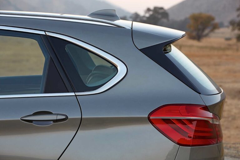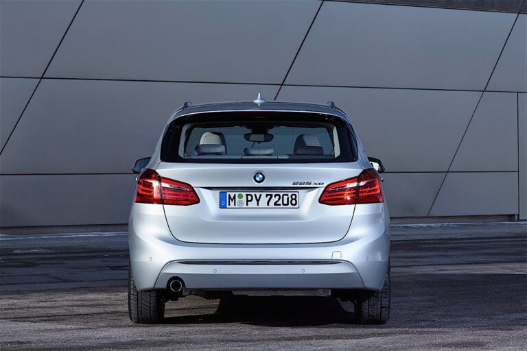 Tylny profil nadaje silne wrażenie szerokości i zapewnia, że sportowy i dynamiczny wygląd BMW serii 2 Active Tourer kontynuuje się wokół pojazdu. Typowe jednostki tylnych lamp w kształcie litery L BMW, opcjonalnie z szerokimi lampami LED, sięgają daleko do bocznych ścian, tworząc płynne przejście między bokami a tyłem pojazdu i zwracając uwagę na nadkola oraz niską sylwetkę pojazdu. Klapa tylna, z niskim progiem i szerokim otworem, zapewnia łatwy dostęp do komory ładunkowej. Pionowe aerodynamiczne wloty powietrza po obu stronach tylnej szyby wraz z tylnym spojlerem nadają atrakcyjnym, nowoczesnym liniom tyłu pojazdu. A przez większość czasu efekt nie jest zaburzony nawet przez wycieraczkę – podczas postoju, wycieraczka pozostaje ukryta wewnątrz tylnego spojlera.