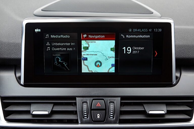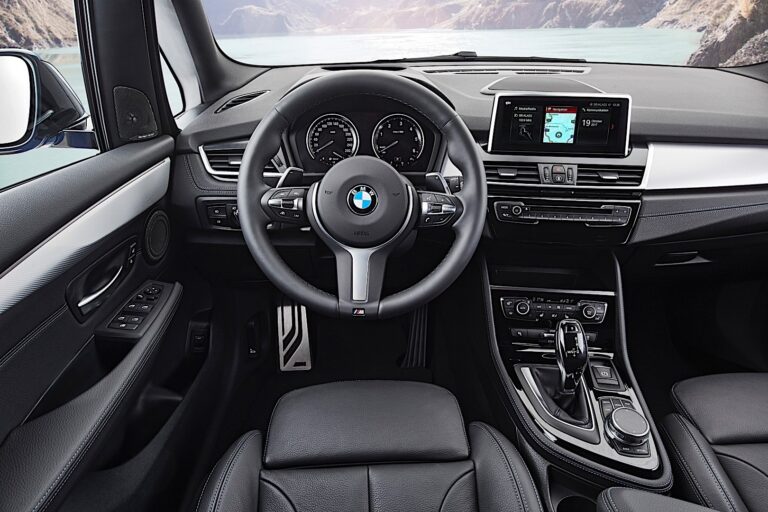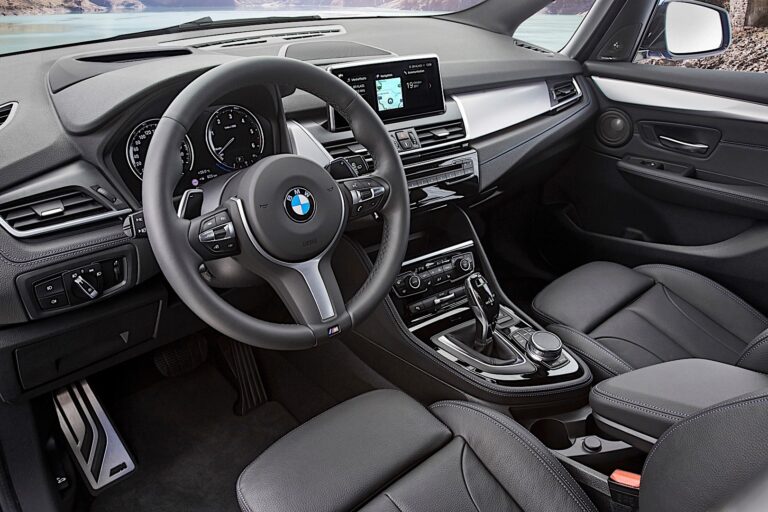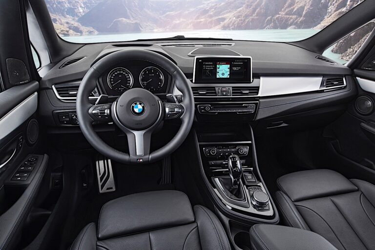 W klasycznym stylu BMW geometria konsoli centralnej wyraźnie koncentruje się na kierowcy. Aktualizacja modelu dotyczy samochodów wyposażonych w siedmiobiegową skrzynię biegów Steptronic z podwójnym sprzęgłem lub ośmiobiegową skrzynię Steptronic, w których zamontowano nowy elektroniczny dźwignię zmiany biegów. Wyraźna wizualna separacja między panelem wskaźników a konsolą centralną sprawia, że panel wskaźników wygląda tak, jakby unosił się w powietrzu, co dodatkowo zwiększa poczucie przestronności. Lekko nachylone powierzchnie podkreślają podniesioną pozycję siedzenia, która jest kluczowym kryterium zakupu dla wielu klientów – wraz z dobrym widokiem wokół i wyraźnym przeglądem pojazdu. Duże wykończenia wykończenia z akcentującymi paskami potwierdzają premium cechy BMW 2-Series Active Tourer i BMW 2-Series Gran Tourer.