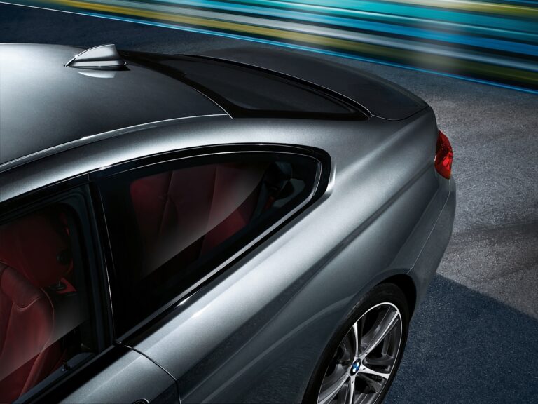 Mocno napięte powierzchnie i precyzyjne, opływowe linie definiują sportowy zarys BMW serii 4 Coupe. Lekko opadająca linia dachu – cecha charakterystyczna coupe – tworzy gładkie przejście do tyłu, wydłuża ogólny wygląd samochodu i elegancko podkreśla sportowy profil boków. Dodatkowo, płytkie, jednorodne grafiki szyb bocznych z bezramowym szkłem oraz charakterystyczne wąskie zagięcie Hofmeistera na końcu słupka C wytwarzają dynamiczne napięcie wizualne. Pod szybami, podwójna linia przetłoczeń – składająca się z dwóch linii charakterystycznych obok siebie – znana z BMW serii 3 współpracuje z wyrazistą linią progów drzwiowych, wzmacniając dynamiczny kształt nadwozia. Mały, zmniejszający cień poniżej linii przetłoczeń nad tylnym kołem podkreśla wypukłe tylne skrzydło, akcentując dynamiczny potencjał samochodu oraz charakterystyczny napęd na tylne koła BMW.