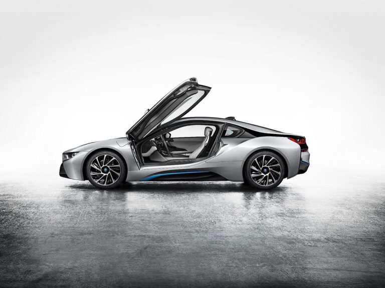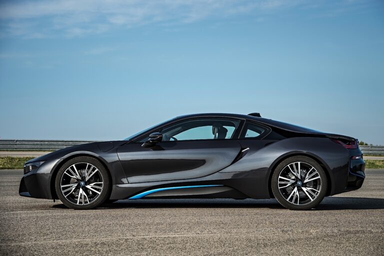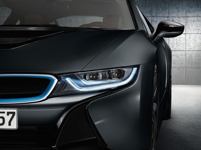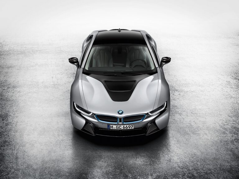 Struktura nakładających się i zazębiających powierzchni – dodatkowo podkreślona przez schemat kolorystyczny pojazdu – także przyczynia się do niepowtarzalnego wyglądu BMW i8. Ta zasada nakładania pozwala aerodynamicznym formom na bycie zapakowanymi w progresywnie stylizowany pakiet, podczas gdy potężnie uformowane nadkola przyciągają uwagę na szeroki rozstaw kół BMW i8. Kompaktowa konstrukcja zarówno silnika elektrycznego, jak i silnika spalinowego pozwala na uzyskanie szczególnie niskiego profilu przednich i tylnych części pojazdu, co podkreśla jego dynamicznie wydłużone boki. Drzwi, które otwierają się do przodu i do góry jak skrzydła, dodają dodatkowego uroku designowi sportowego samochodu BMW i8.