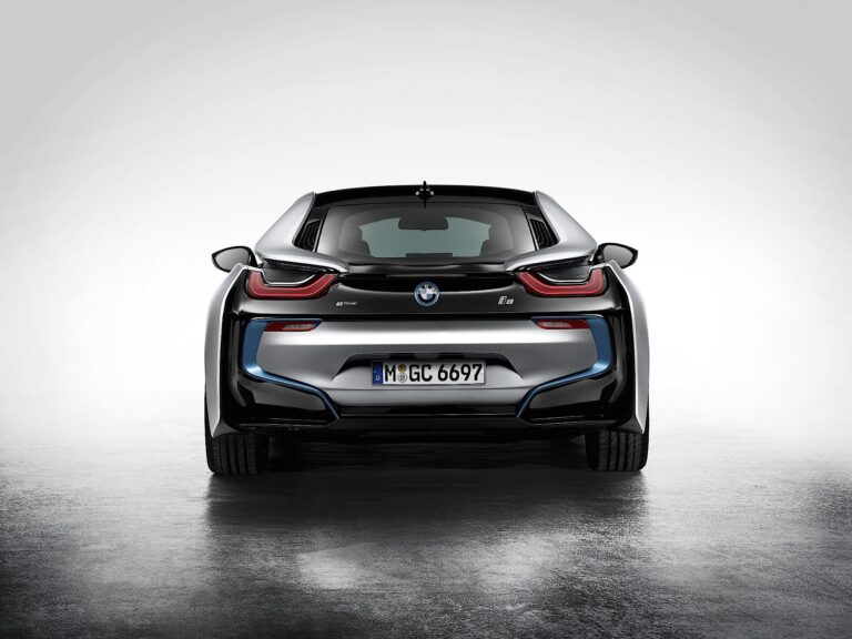 Niska sylwetka tylnej części i jej poziome linie podkreślające szerokość również wyraźnie eksponują dynamiczny potencjał BMW i8. Tył jest otoczony rzeźbionymi nadkolami. Opadające tylne okno otwiera się wysoko, umożliwiając łatwy dostęp do schowka znajdującego się pod nim. Tylne światła, reflektory i dyfuzor tylny tworzą jedną jednostkę wizualną, która wzmacnia już mocny wygląd samochodu. Podobnie jak reflektory, misternie zaprojektowane zespoły tylne również charakteryzują się charakterystycznym designem w kształcie litery U BMW i. Kierunkowskazy są zintegrowane nad tylnymi światłami w opadającym kształcie linii dachu. Wszystkie światła w BMW i8 są standardowo w technologii LED.
