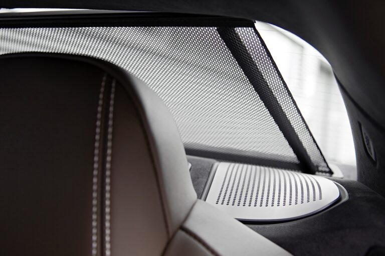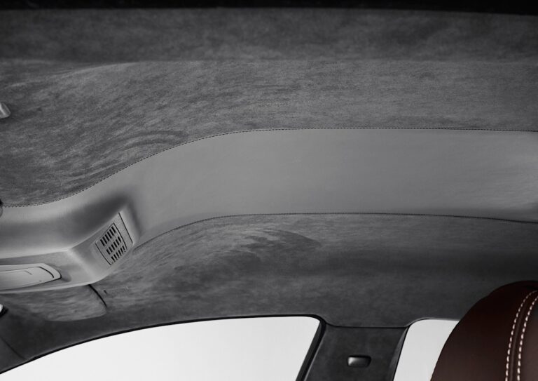 Ten niezwykle lekki, imponująco mocny materiał wysokotechnologiczny jest również stosowany w konstrukcji dachu. Tutaj widoczna struktura węglowa stanowi atrakcyjny detal, podobnie jak dynamiczne wcięcie w centralnej części dachu. To wcięcie ma swoje odzwierciedlenie w stylistyce wnętrza samochodu, gdzie antracytowy podsufitka z Alcantary zyskuje centralny fragment wykonany ze skóry.