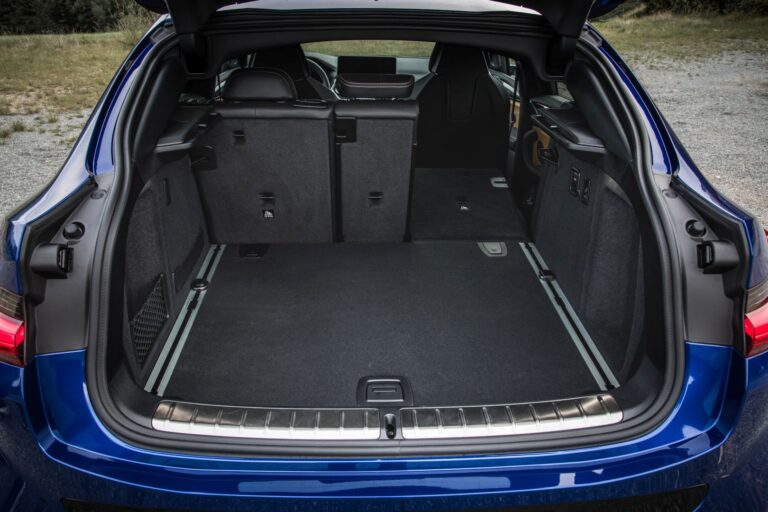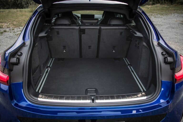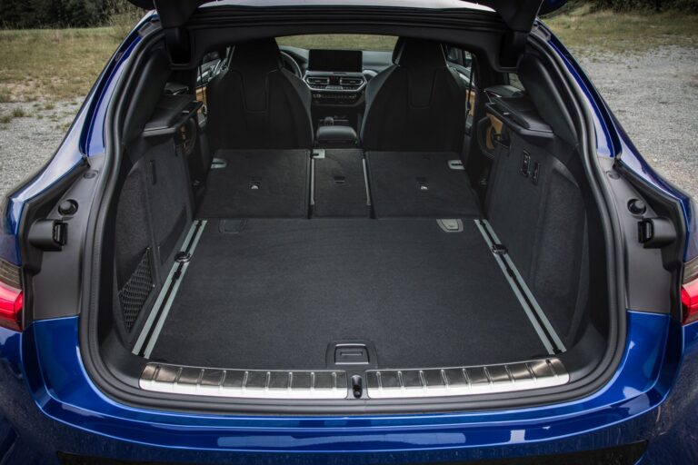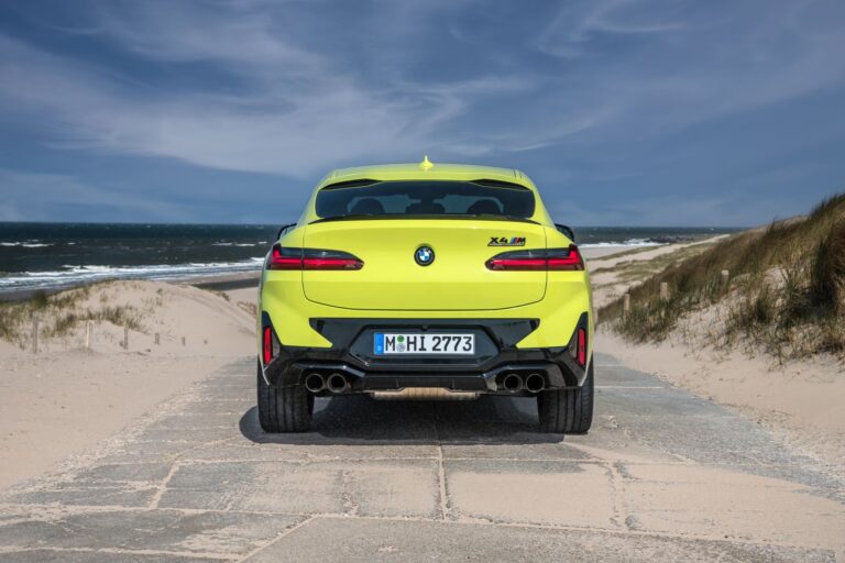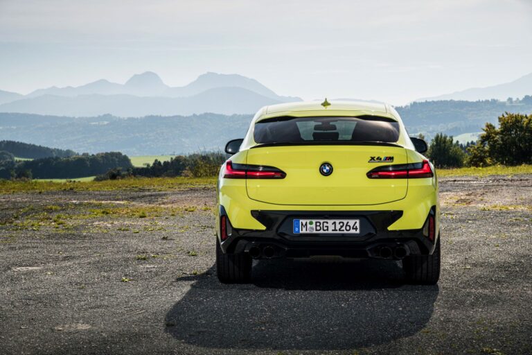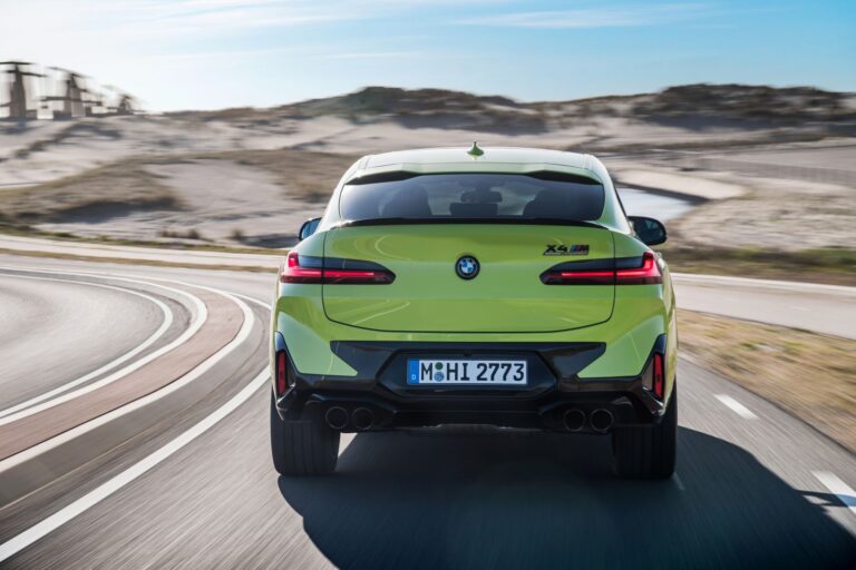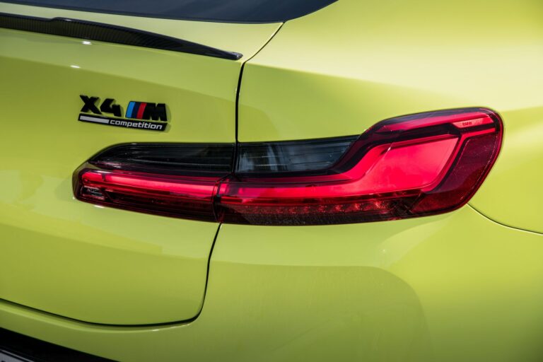 Nowe BMW X3 M Competition charakteryzuje się nowo zaprojektowanymi tylkimi reflektorami LED pełnozakresowymi z odświeżonego BMW X3. Czarne ramki nadają tylnym światłom bardziej precyzyjny wygląd, podczas gdy węższa grafika świetlna teraz zawiera trójwymiarowy zarys szczypiec i poziome kierunkowskazy zintegrowane w stylu filigranowym. Akcentowanie poziomych linii – na przykład w wklęsłym obszarze na dolnej krawędzi pokrywy bagażnika – przyczynia się do schludnego wyglądu tylnej części, a odblaski teraz znajdują się pionowo w zderzaku. Dolna część tylnego zderzaka jest specyficzna dla M i ma wykończenie w wysokim połysku na czarno. Duży dyfuzor jest flankowany z prawej i lewej strony przez pary końcówek wydechu sportowego M, które są wykończone na czarno w kolorze chromu. Płaskie tylne reflektory pełnozakresowe w BMW X4 M Competition podkreślają szerokość pojazdu, strzelając w trójwymiarowym designie z nadwozia.