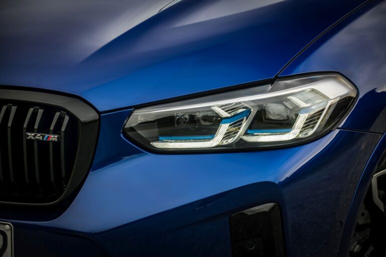 Uderzającym elementem z przodu jest odnowiona kratka chłodnicy BMW, jak również reflektory, które są około dziesięć milimetrów płaskie. Kratka chłodnicy BMW jest większa niż wcześniej, a teraz składa się z jednoczęściowej ramy. Czarna belka z logo iCam wizualnie oddziela kratkę. Rama jest wykończona w wysokim połysku na czarno, podobnie jak typowe dla M podwójne żebra kratki. Kratka chłodnicy zawiera również logo specyficzne dla pojazdu: X3 M lub X4 M. Spłaszczone przednie reflektory to adaptacyjne reflektory LED z funkcją matrycową w standardzie, składające się z nowo zaprojektowanych, półotwartych rur świetlnych, które nawiązują do klasycznej czterooktowej twarzy jako światła do jazdy dziennej LED. Oprócz reflektorów BMW Individual Shadow Line z przyciemnionymi wstawkami na górnych krawędziach, dostępne jest również światło Lasera BMW jako opcjonalne wyposażenie. Jego dynamiczny moduł światła laserowego wzmacnia długie światła LED, gdy prędkość przekracza 60 km/h i podąża za kształtem drogi. Zasięg długich świateł zwiększa się do nawet 650 metrów. Intensywność światła bardzo jasnego i mocnego światła laserowego BMW jest również szczególnie wysoka. W ramach dynamicznego rozkładu światła i systemu antyoślepiającego BMW Selective Beam długie światła wspierają również światło mijania podczas jazdy po drogach krajowych i autostradach.