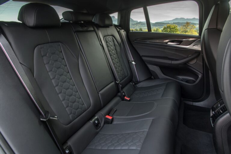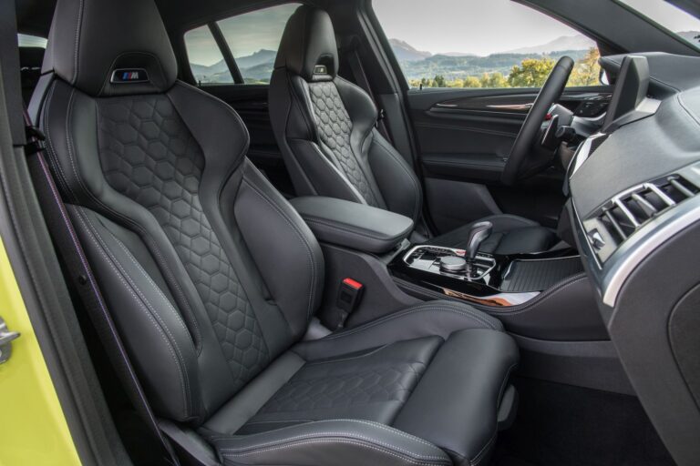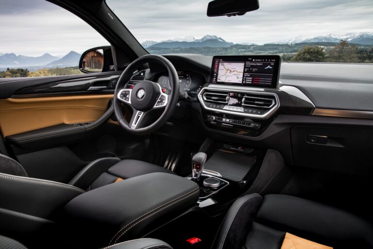 BMW X3 M Competition oraz BMW X4 M Competition mają standardowo sportowe siedzenia M z elektrycznie regulowanymi zagłówkami i podświetlanym logo M. Udoskonalona tapicerka skórzana Merino dostępna jest w kolorze czarnym, a także w wariantach dwukolorowych Sakhir Orange/Czarny, Adelaide Grey/Sakhir Orange oraz Midrand Beige/Czarny; ten ostatni ma również aplikacje z Alcantary, które pokrywają podparcia na bokach konsoli centralnej. Tapicerka skórzana Merino BMW Individual w kolorze Tartufo jest również dostępna jako opcja dla sportowych siedzeń M. Pasy bezpieczeństwa są wizualnie wzmocnione paskami BMW M. Wloty powietrza mają nowe galwanizowane wykończenia, podczas gdy wykończenia wnętrza teraz pojawiają się w Aluminium Rhombicle dark w standardzie. Oprócz wykończeń wnętrza M w włóknie węglowym oraz wykończeń wnętrza BMW Individual w wysokim połysku Piano Black, wykończenia w nowej wersji w otwartych porach Ash są teraz również dostępne jako opcja. Skórzana kierownica M z funkcjami wielofunkcyjnymi ma kontrastowe przeszycia w kolorach BMW M oraz otwarty ramionko 6 godzin. Oparcie tylnych siedzeń ma w standardzie podział 40:20:40 i jako opcja pozwala na indywidualną, wielostopniową regulację nachylenia poprzez funkcję ładunkową. Standardowa pojemność bagażnika wynosząca 550 litrów może być zwiększona do maksymalnie 1 600 litrów w BMW X3 M Competition i z 525 litrów do maksymalnie 1 430 litrów w BMW X4 M Competition.