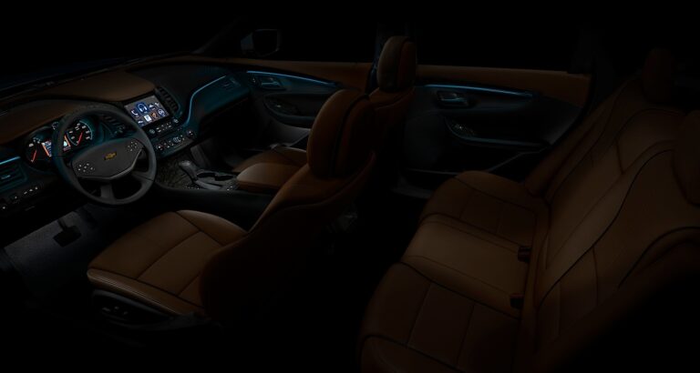Luksusowe materiały wykończeniowe i detale, takie jak wysokiej jakości tkaniny, mikrofibra i perforowana skóra, uzupełniają ciche środowisko i nadają Impali charakterystyczny wygląd i odczucie. Zespół wskaźników ma bogaty wygląd, z wielowymiarowymi wskaźnikami i konfigurowalnym kolorowym centrum informacji dla kierowcy z 4.2-calowym ekranem. Lodowe-niebieskie oświetlenie zespołu wskaźników potęguje ekskluzywną atmosferę kabiny, a dostępne chromowane wykończenia z „przenikającym” oświetleniem ambientowym dodatkowo podkreślają elegancki styl wnętrza. Całkowicie zmienia wygląd wykończenia, oświetlając je podczas jazdy nocą.